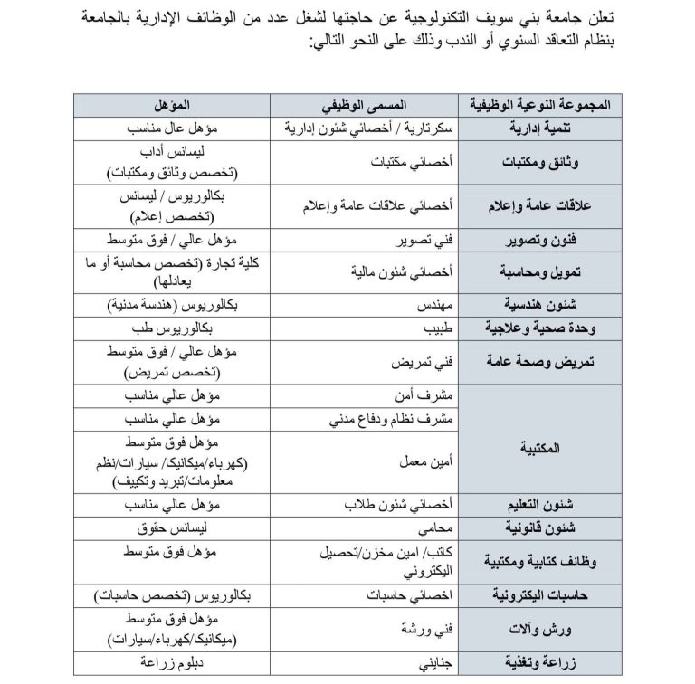 ما هي التخصصات المطلوبة في وظائف جامعة بني سويف التكنولوجية؟