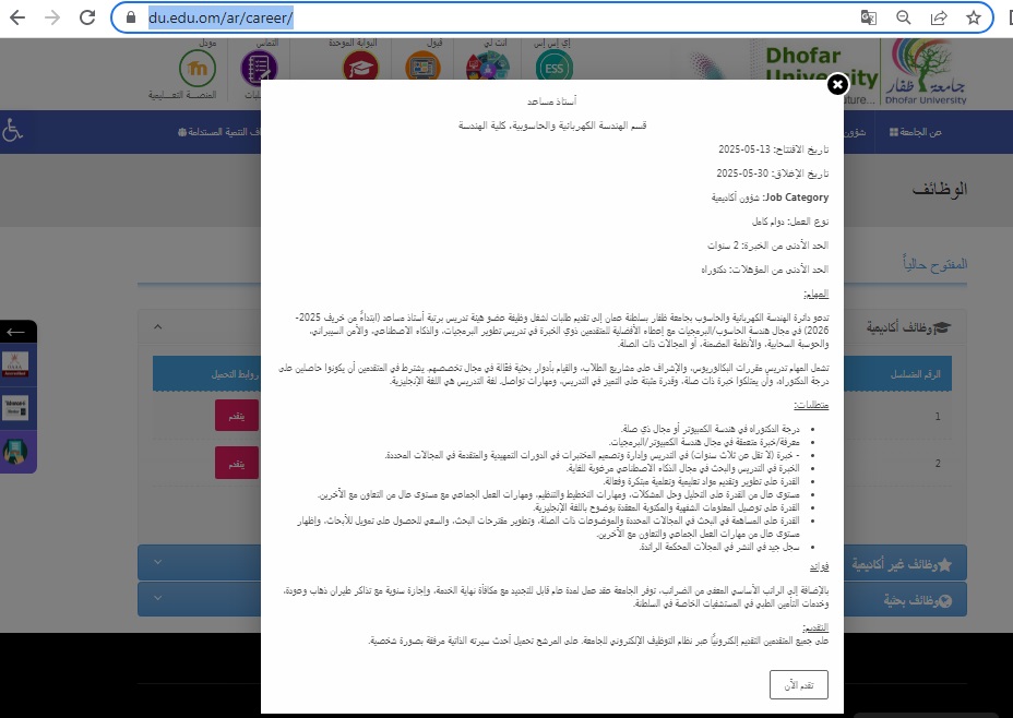طريقة التقديم على وظيفة أستاذ مساعد في جامعة ظفار