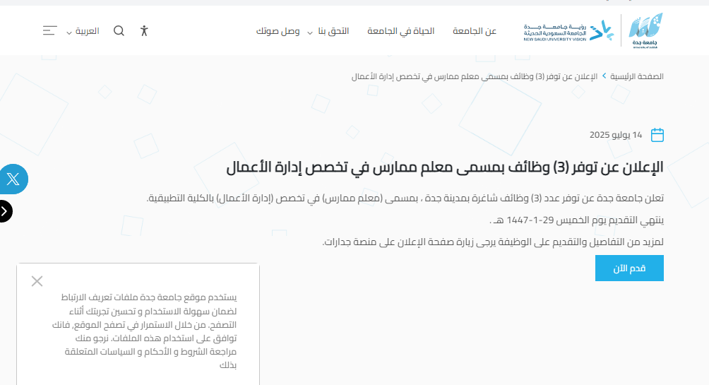 لمطالعة إعلان وظيفة جامعة جدة عبر الموقع الرسمي والتقديم اضغط هنا