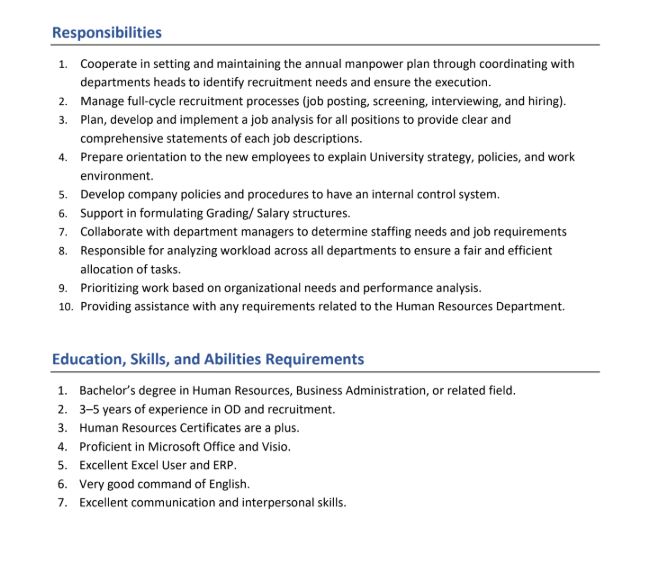 7. التعاون مع مديري الأقسام لتحديد احتياجات التوظيف ومتطلبات الوظيفة.