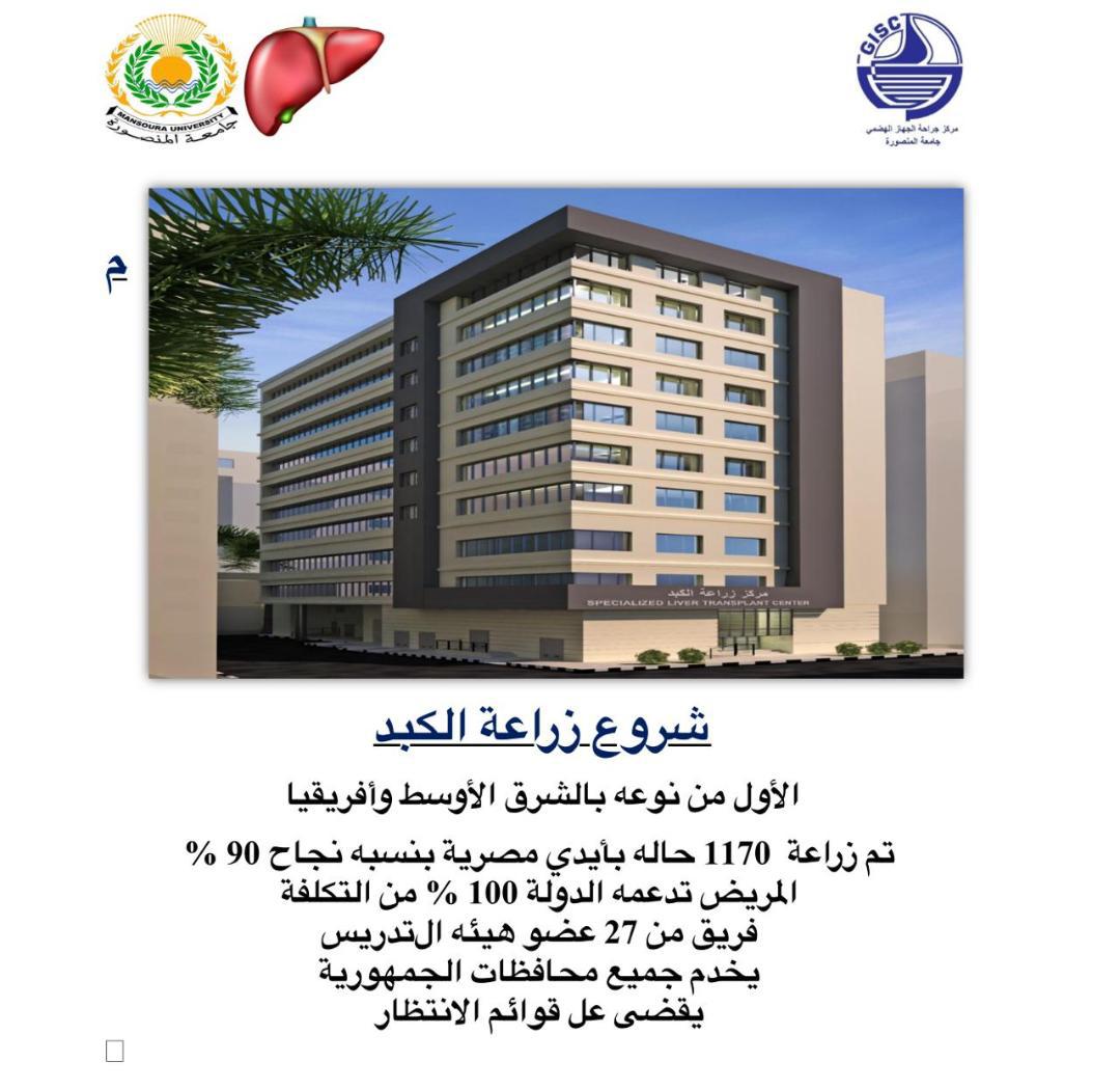 نعم أقولها بملء فمى بعد أن قادتنى الظروف أن أزور هرما رابعا فى مصر داخل جامعة المنصورة بدأ نشاطه منذ أشهر قليلة فقط بعد أن أمر الرئيس عبد الفتاح السيسى بتجهيزه بالكامل بكل المعدات والأجهزة الطبية الحديثة بتكلفة وصلت إلى750 مليون جنيه بعد أن تبرع أحد أبناء المنصورة ببناء الجزء الخرسانى منه ليصل إرتفاعه إلى عشرة أدوار ويصبح المركوز الوحيد من نوعه ليس فى مصر أو الشرق الأوسط بل فى العالم كله وهو مركز زراعة الكبد بجامعة المنصورة بعد أن إعتمد د0شريف خاطر رئيس الجامعة قرار مجلس الجامعة بأن يكون هذا الصرح تحت مسمى " مركز زراعة الكبد "