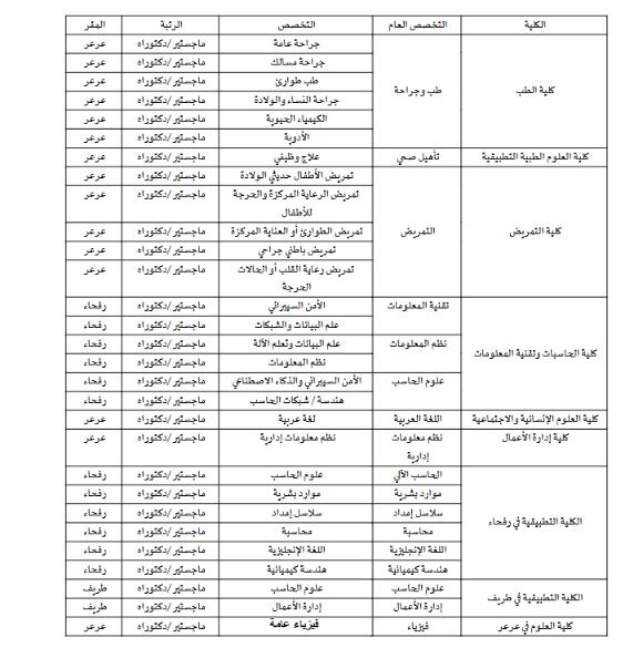 ويستعرض موقع السبورة وظائف أعضاء هيئة التدريس في جامعة الحدود الشمالية والتي شملت 9 كليات، وجاءت التخصصات كالتالي: