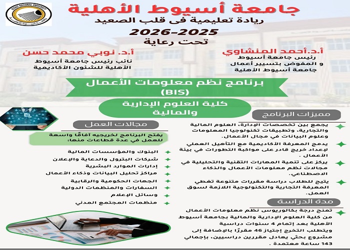 تنسيق الجامعات 2025 | جامعة أسيوط الأهلية تعلن إطلاق برنامج نظم معلومات الأعمال BIS بكلية العلوم الإدارية
