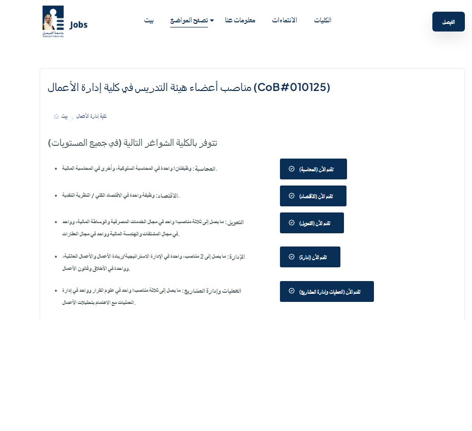 تشمل الوظائف المعلنة مجالات متعددة، حيث تتوفر وظيفتان في قسم المحاسبة، الأولى في مجال المحاسبة السلوكية، والثانية في المحاسبة المالية. كما أعلنت الكلية عن وظيفة واحدة في قسم الاقتصاد متخصصة في الاقتصاد الكلي أو النظرية النقدية.