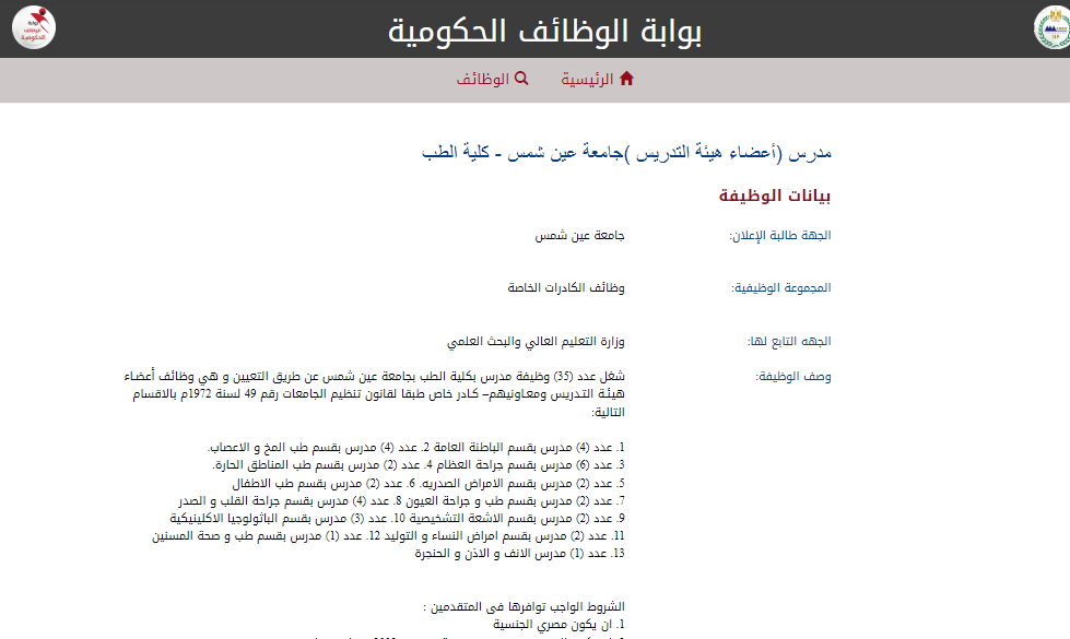 وظيفة جامعة .. أعلنت كلية الطب جامعة عين شمس ، عن حاجتها لشغل 35 وظيفة مدرس (أعضاء هيئة تدريس) عن طريق التعيين، في 13 قسمًا تخصصيًا، وذلك وفق أحكام قانون تنظيم الجامعات رقم 49 لسنة 1972 ولائحته التنفيذية.