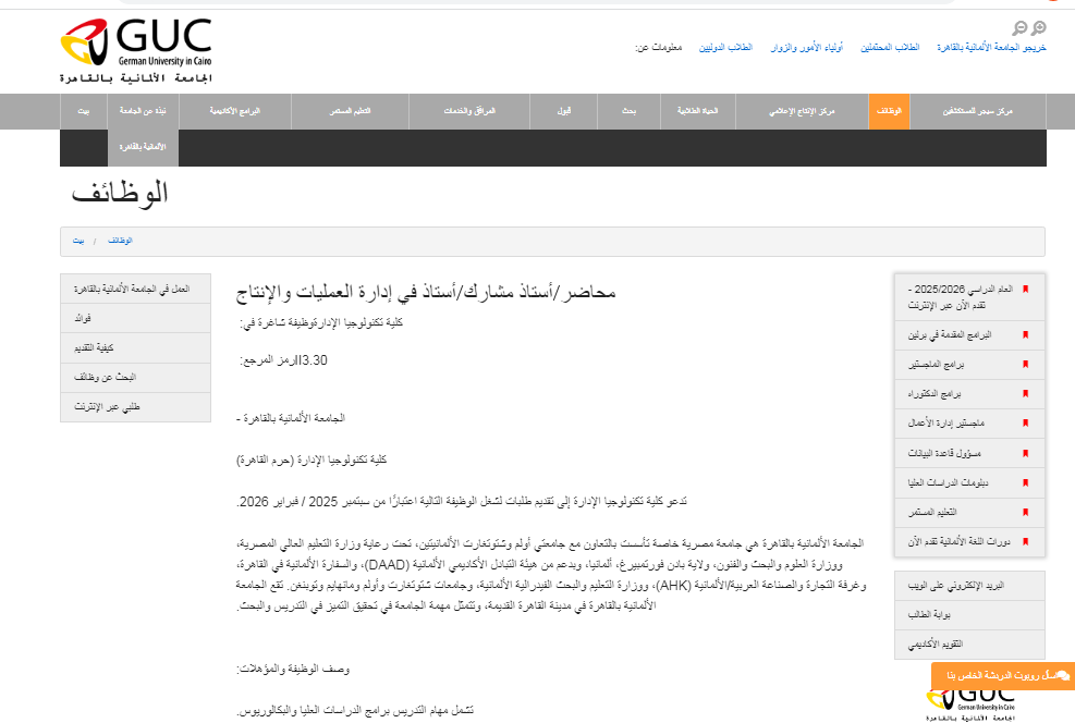 وظيفة جامعة.. أطلقت الجامعة الألمانية بالقاهرة إعلانًا جديدًا لتعيين محاضر أو أستاذ مشارك أو أستاذ في تخصص إدارة العمليات والإنتاج، ضمن كلية تكنولوجيا الإدارة، وذلك لبدء العمل اعتبارًا من سبتمبر 2025 أو فبراير 2026.