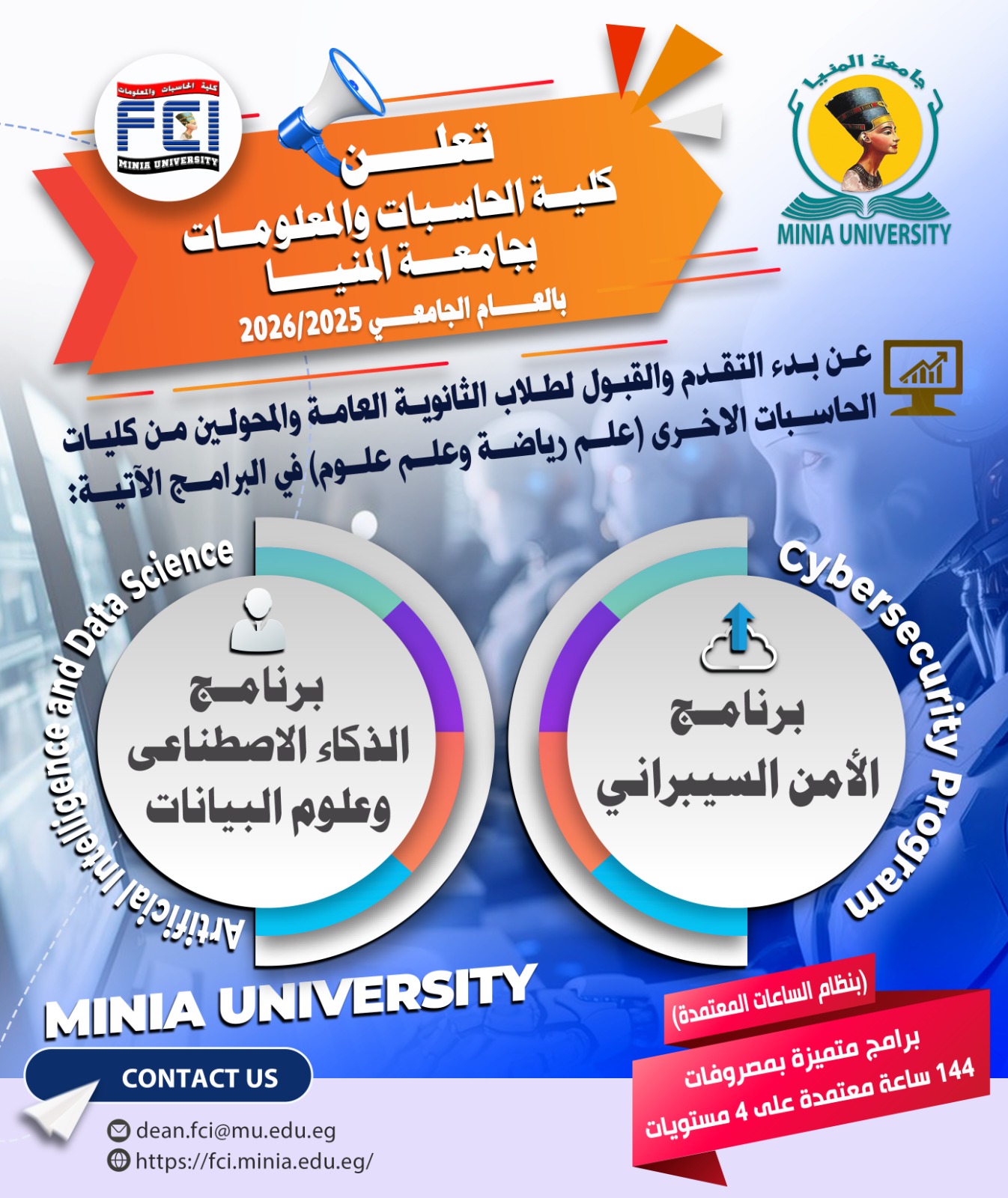 بداية من العام الدراسى القادم.. بدء الدراسة ببرنامجي الذكاء الاصطناعي وعلوم البيانات والأمن السيبراني بكلية الحاسبات والمعلومات جامعة المنيا