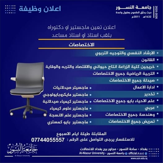وعلى الراغبين في الحصول على وظائف جامعة النسور، الدخول على موقع جامعة النسور عبر شبكة الانترنت، والتقديم متاح الآن، والمقابلة طيلة ايام الاسبوع.. للاستفسار يرجى التواصل على الرقم: 07744055557 بغداد - ساحة النسور - مجاور برج بغداد للاتصالات Al-Nisour University - جامعة النسور official.n.u.c - www.uon.edu.iq