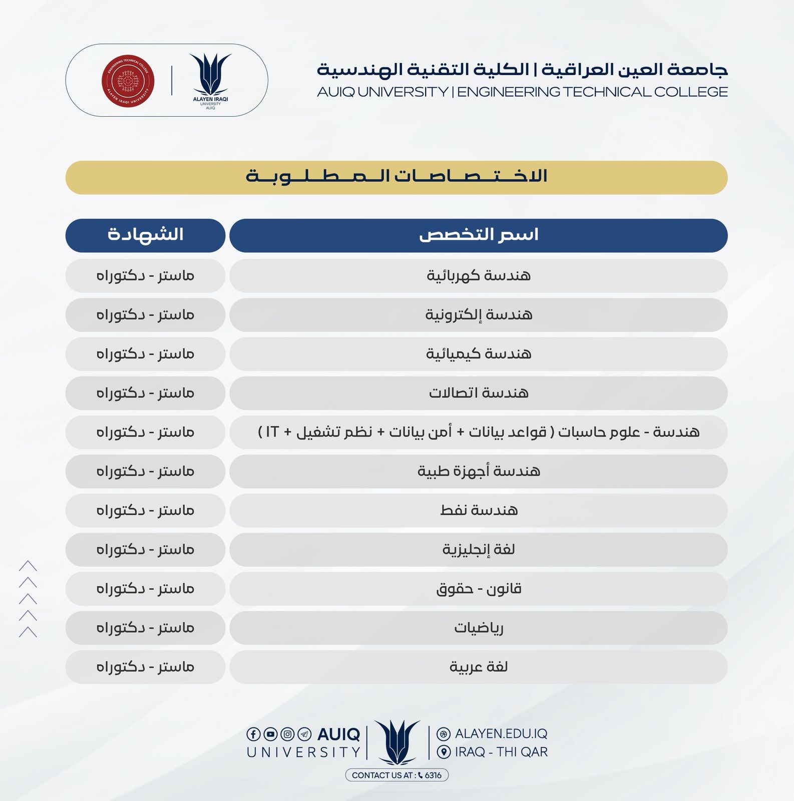 التخصصات المطلوبة في وظائف جامعة العين العراقية