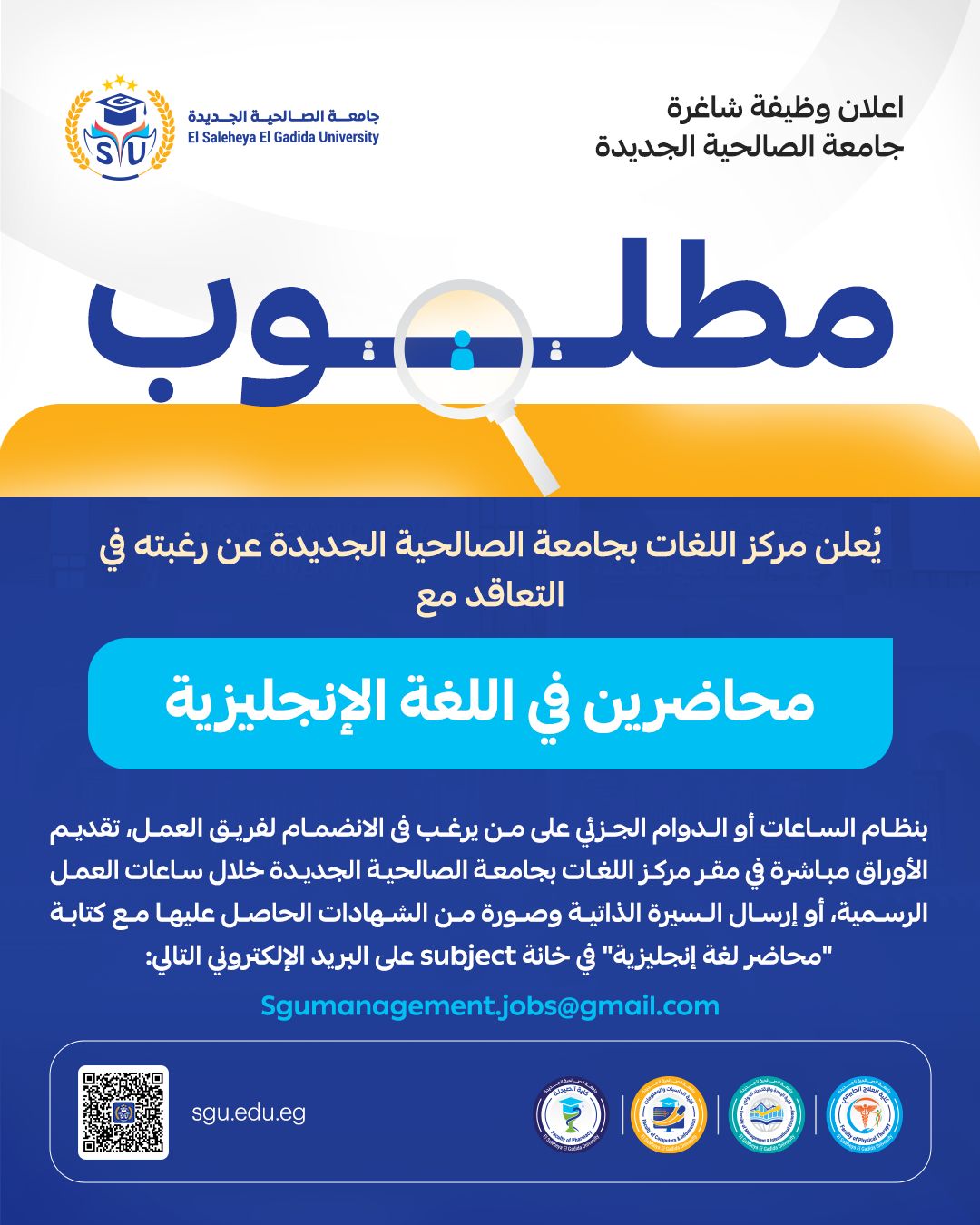 وأشار مركز اللغات إلى أن التقديم متاح للراغبين في الانضمام إلى الفريق الأكاديمي إما من خلال التوجه مباشرة إلى مقر المركز بجامعة الصالحية الجديدة خلال ساعات العمل الرسمية، أو عبر إرسال السيرة الذاتية مرفقًا بها صور من الشهادات الدراسية والدورات التدريبية على البريد الإلكتروني الرسمي: [email protected]، مع ضرورة كتابة عبارة "محاضر لغة إنجليزية" في خانة الموضوع (Subject).