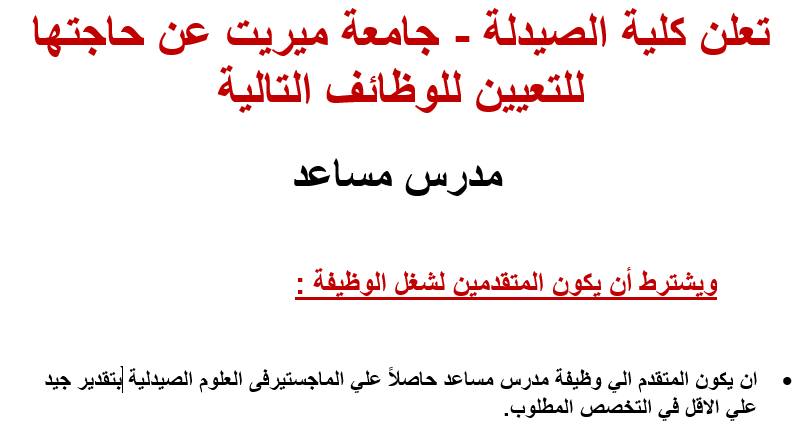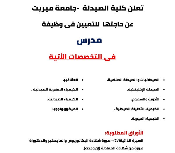 تعلن كلية الصيدلة - جامعة ميريت عن حاجتها للتعيين للوظائف التالية