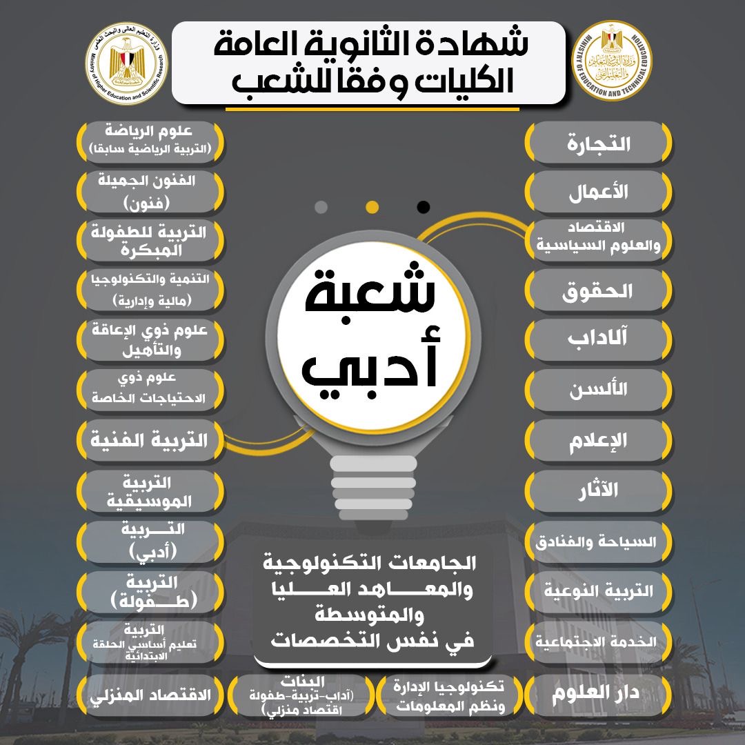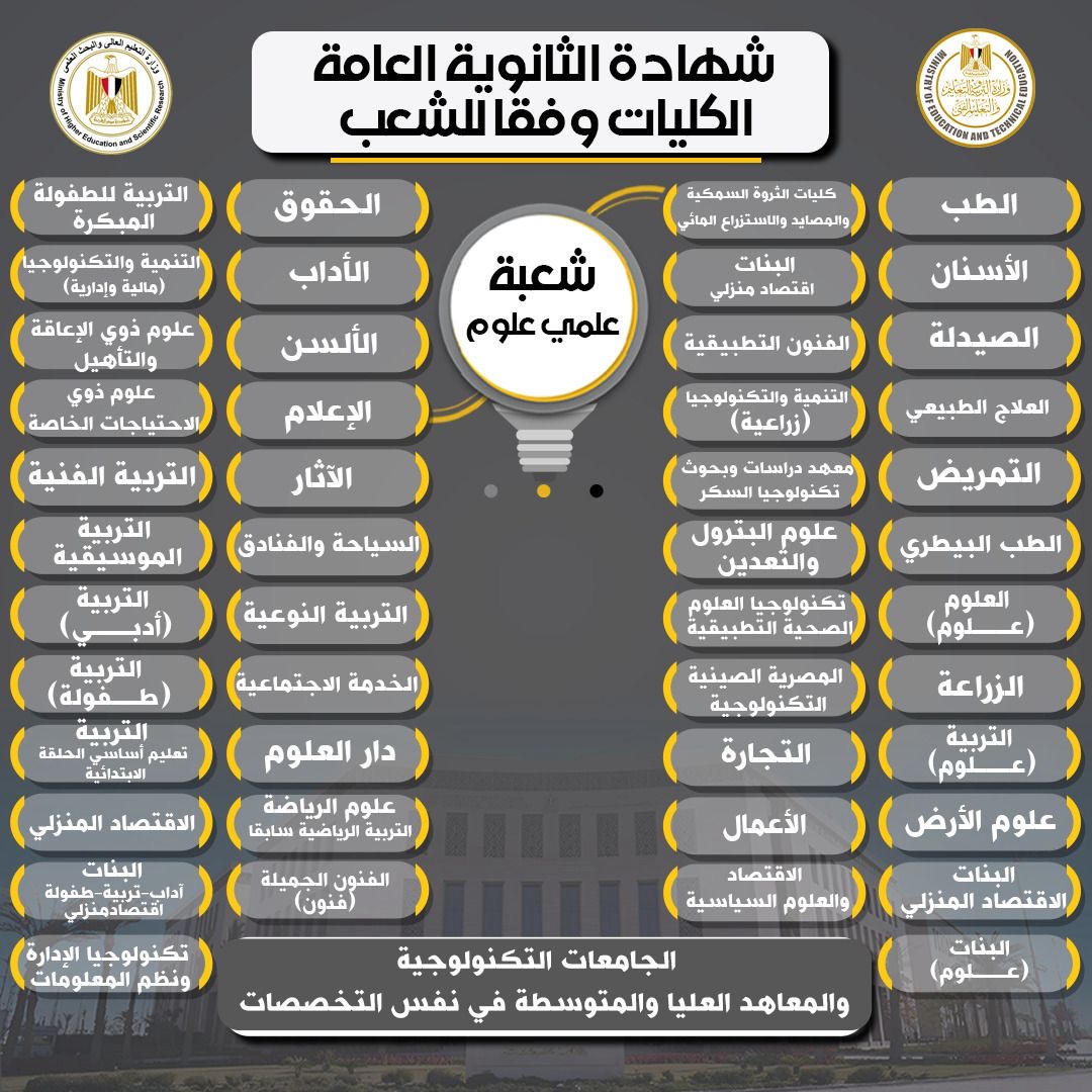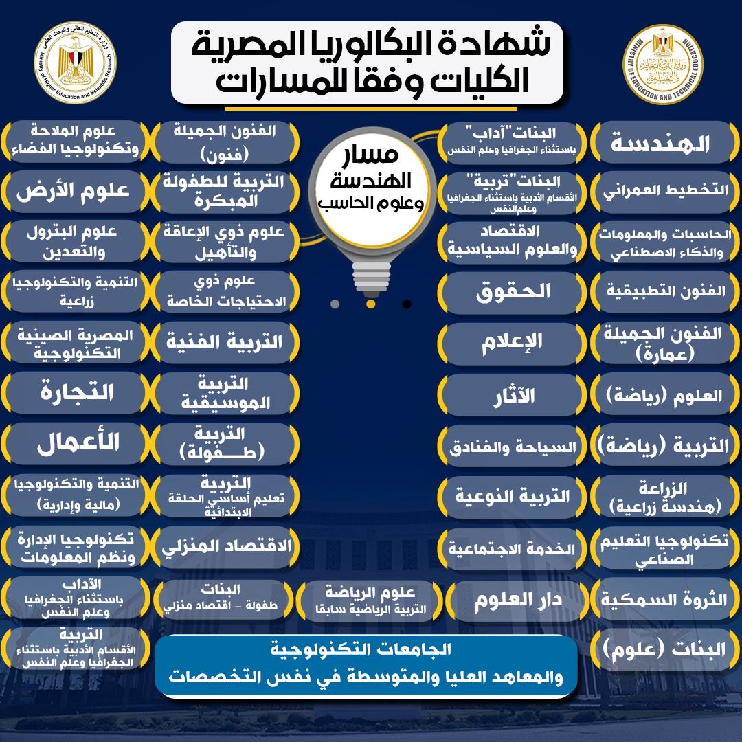 التفاصيل الخاصة بالكليات المتاحة للمسارات المختلفة في نظامي البكالوريا الجديد والثانوية العامة