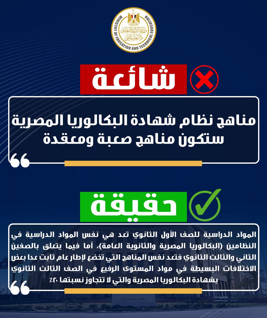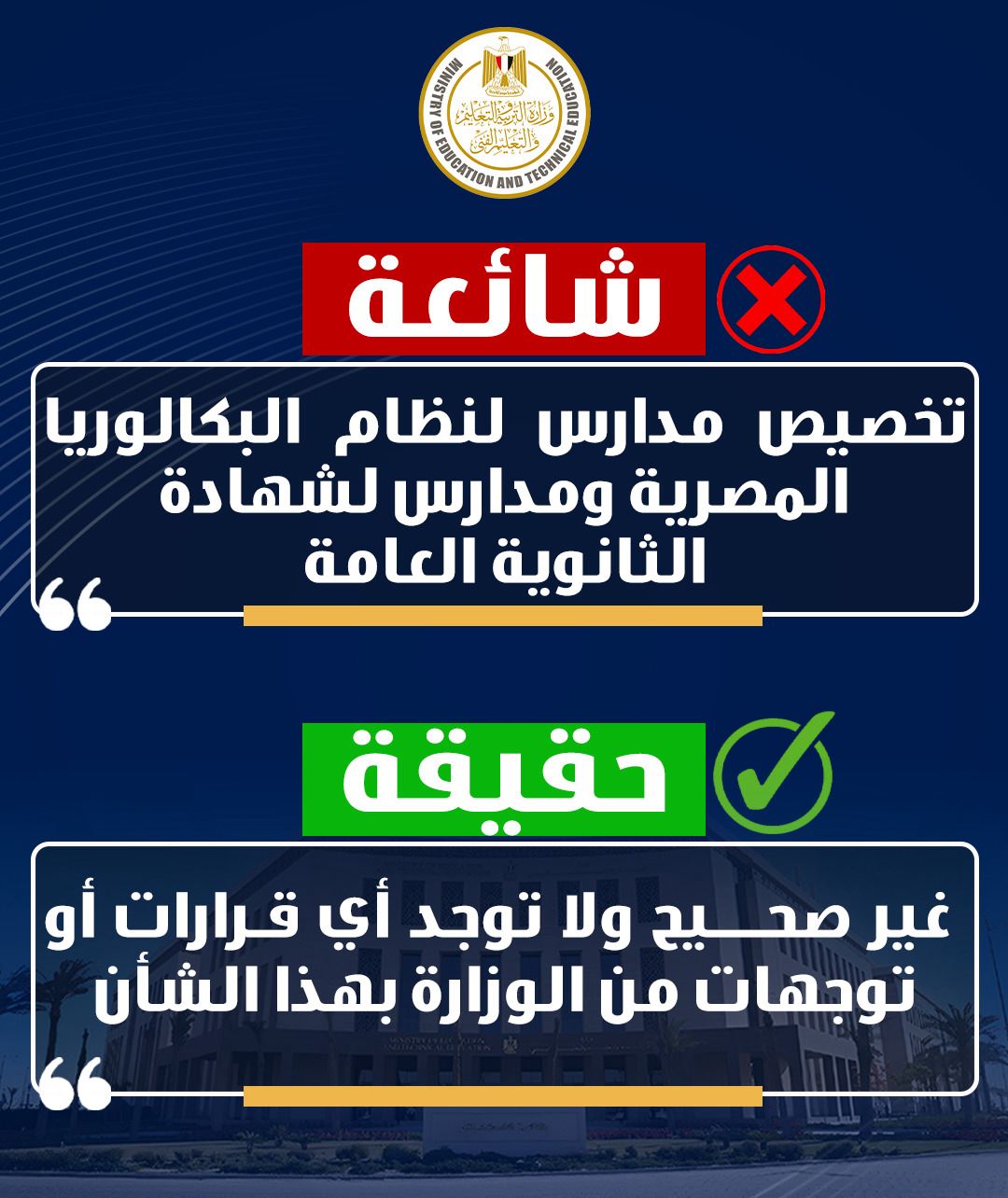 ١- تداول شائعة حول تخصيص مدارس لنظام البكالوريا المصرية ومدارس لشهادة الثانوية العامة وهو أمر غير صحيح مطلقا وغير قانوني ولا توجد أي قرارات أو توجهات من الوزارة بهذا الشأن.