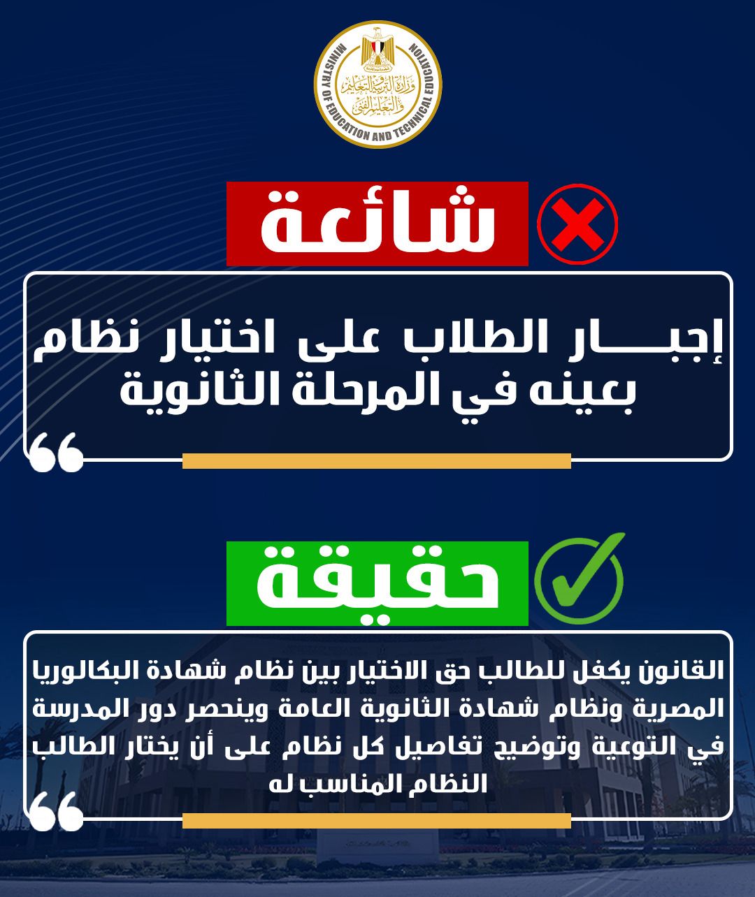 ٢- تداول شائعة حول إجبار الطلاب على اختيار نظام بعينه في المرحلة الثانوية، وهو أمر عاري تماما عن الصحة، حيث أكدت الوزارة مرارا أن القانون يكفل للطالب حق الاختيار بين نظام شهادة البكالوريا المصرية ونظام شهادة الثانوية العامة وينحصر دور المدرسة في التوعية وتوضيح تفاصيل كل نظام على أن يختار الطالب النظام المناسب له.