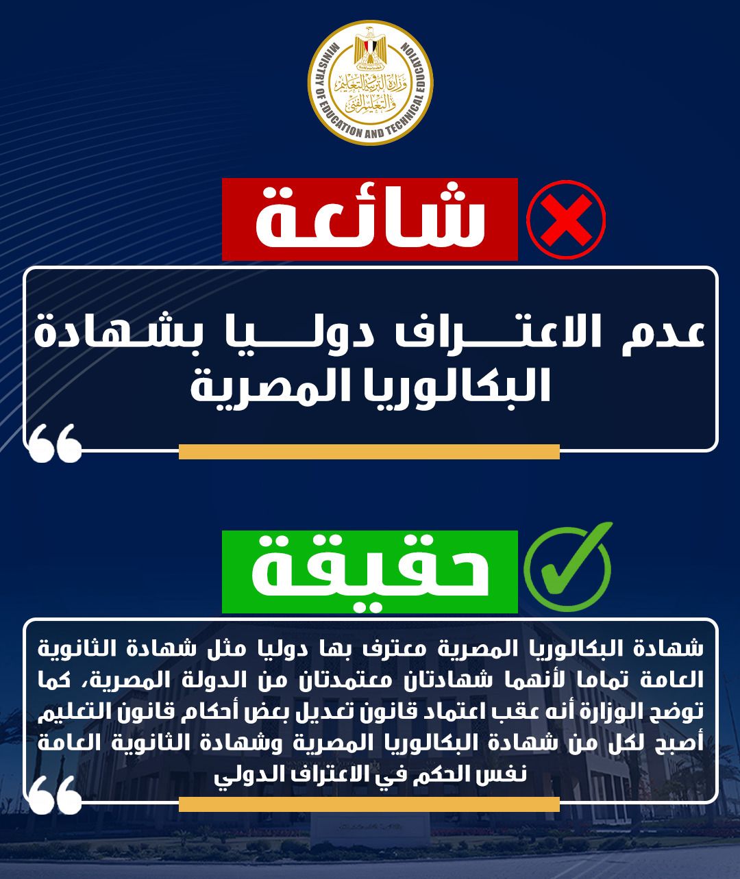 ٥- تداول شائعة حول عدم الاعتراف دوليا بشهادة البكالوريا المصرية، وفي هذا الإطار توضح الوزارة أن شهادة البكالوريا المصرية معترف بها دوليا مثل شهادة الثانوية العامة تماما وليس هناك اختلاف بينها وبين الثانوية العامة لأنهما شهادتان معتمدتان من الدولة المصرية، كما توضح الوزارة أنه عقب اعتماد قانون تعديل بعض أحكام قانون التعليم أصبح لكل من شهادة البكالوريا المصرية وشهادة الثانوية العامة نفس الحكم في الاعتراف الدولي.
