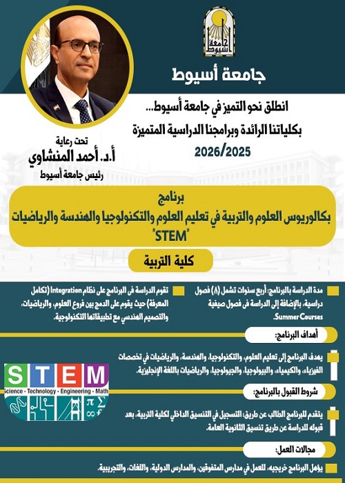 تواصل كلية التربية في جامعة أسيوط تقديم برنامج بكالوريوس العلوم والتربية STEM، وهو برنامج رائد في تعليم العلوم والتكنولوجيا والهندسة والرياضيات باللغة الإنجليزية. يهدف البرنامج إلى إعداد معلمين متخصصين في الفيزياء، الكيمياء، الأحياء، الجيولوجيا، والرياضيات، وفق أحدث النظم التعليمية، مما يعزز مكانة الجامعة كوجهة أولى للراغبين في دراسة تعليم STEM في مصر.