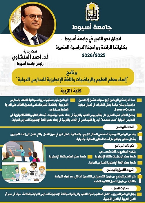 تقدم كلية التربية في جامعة أسيوط برنامجًا متميزًا لإعداد معلم العلوم والرياضيات واللغة الإنجليزية للمدارس الدولية بنظام الساعات المعتمدة، تحت إشراف نخبة من أساتذة الكلية. ويُعد البرنامج من التخصصات الرائدة المطلوبة داخل مصر وخارجها، حيث يمنح الخريج شهادة بكالوريوس العلوم والتربية أو ليسانس الآداب والتربية وفق التخصص.