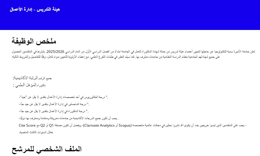 وأوضحت الجامعة في بيانها أن باب التقديم مفتوح أمام جميع الرتب الأكاديمية، مع إعطاء الأولوية للتعيين بدوام كامل، مع إمكانية النظر في طلبات التفرغ العلمي لمن تنطبق عليهم الشروط. وتشترط الجامعة أن يكون المتقدم حاصلًا على شهادة البكالوريوس في إدارة الأعمال بتقدير لا يقل عن جيد، والماجستير في التخصص ذاته بتقدير لا يقل عن جيد جدًا، بالإضافة إلى شهادة الدكتوراه في إدارة الأعمال بتقدير لا يقل عن جيد جدًا أيضًا. كما شددت على أن تكون جميع المؤهلات من جامعات مرموقة ومعترف بها دوليًا، بما يضمن توافر معايير الجودة والاعتماد الأكاديمي في السيرة التعليمية للمتقدمين.