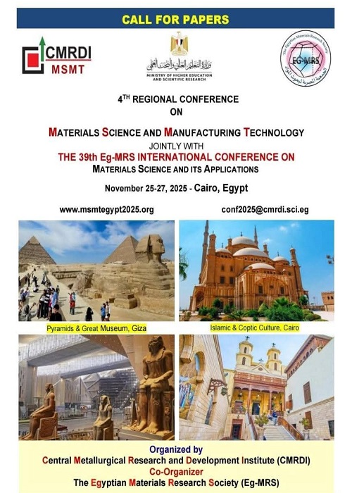 تستضيف القاهرة فعاليات المؤتمر الإقليمي لعلوم المواد وتقنية التصنيع MSMT 2025 خلال الفترة من 25 إلى 27 نوفمبر 2025 بفندق سوفيتيل الجزيرة. ويُنظم المؤتمر مركز بحوث وتطوير الفلزات CMRDI بالتعاون مع الجمعية المصرية لأبحاث المواد Eg-MRS، بالتزامن مع المؤتمر الدولي التاسع والثلاثين للجمعية المصرية لأبحاث المواد، ليصبح منصة علمية رائدة تجمع الباحثين والخبراء في مجال علوم المواد والتقنيات الصناعية.