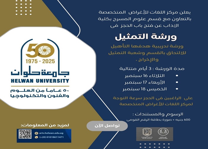 في إطار سعي جامعة حلوان المستمر لدعم المواهب الطلابية وتنمية القدرات الإبداعية، أعلن مركز اللغات للأغراض المتخصصة بكلية الآداب جامعة حلوان بالتعاون مع قسم علوم المسرح عن إطلاق ورشة تدريبية جديدة بعنوان ورشة التمثيل، والمقرر تنظيمها خلال سبتمبر 2025.
