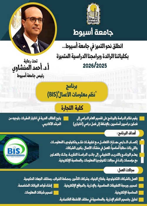 تقدم كلية التجارة في جامعة أسيوط برنامج نظم معلومات الأعمال BIS باللغة الإنجليزية بنظام الساعات المعتمدة، لتصبح ثالث جامعة حكومية في مصر تقدم هذا التخصص. ويُعد البرنامج نقلة نوعية تجمع بين علوم الإدارة والمال والأعمال من جهة، وتكنولوجيا المعلومات وتطبيقاتها من جهة أخرى، مما يعزز مكانة جامعة أسيوط كأحد أبرز مراكز التعليم المتطور.