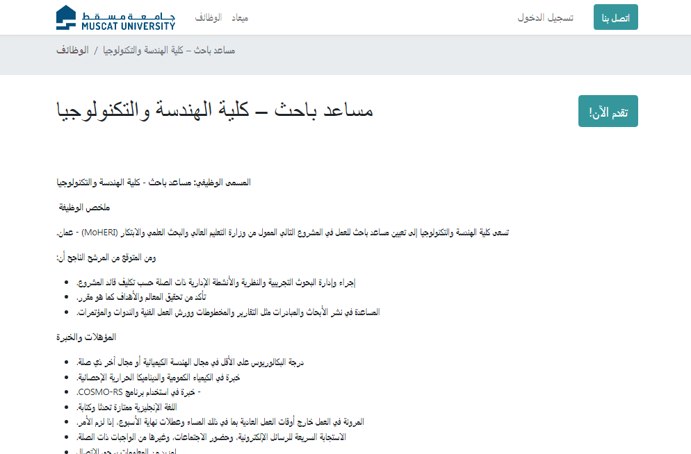 وظيفة جامعة .. كشفت جامعة مسقط في سلطنة عمان عن توافر فرصة وظيفية مميزة للعمل في كلية الهندسة والتكنولوجيا، حيث أعلنت عن حاجتها إلى تعيين مساعد باحث للمشاركة في مشروع بحثي ممول من وزارة التعليم العالي والبحث العلمي والابتكار.