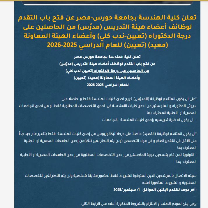 تعلن جامعة حورس، عن فتح باب التقدم لوظائف أعضاء هيئة التدريس، من المدرسين الحاصلين على درجة الدكتوراه (تعيين-ندب كلي) وأعضاء الهيئة المعاونة (معيد) (تعيين) للعام الدراسي 2025-2026، وعلى الراغبين في الحصول على وظائف جامعة حورس، الدخول على موقع جامعة حورس عبر شبكة الانترنت.