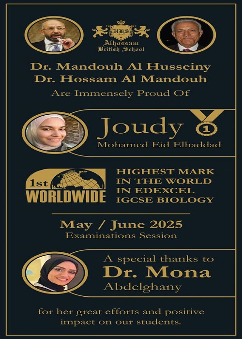 جدير بالذكر، حققت مدرسة الحسام الدولية تحت قيادة الدكتور المندوه الحسيني رئيس مجلس الإدارة والنائب الدكتور حسام المندوه الحسيني نائب رئيس مجلس الإدارة إنجازا أكاديميا جديد يضاف للإنجازات المتتالية التي تحققت خلال السنوات الماضية حيث حصدت المدرسة المركز الأول عالميا في ( Pearson Edexcel IGCSE Mathematics ) في امتحانات دور مايو 2024 بحصول الطالبة هنا محمد فهمي الضاوي على العلامة النهائية ( 200 / 200 ) متفوقه على جميع من خاضوا هذه الاختبارات من مختلف دول العالم.