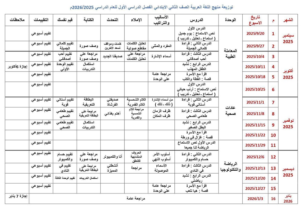 توزيع منهج اللغة العربية الصف الثاني الابتدائي 2026
