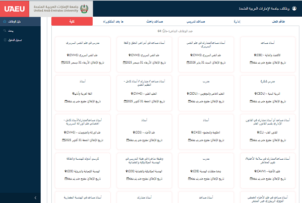 وتشمل هذه الفرص وظائف بدرجات مدرس، أستاذ مساعد، أستاذ مشارك، وأستاذ كامل، في تخصصات متنوعة تغطي مجالات الطب، والهندسة، والعلوم، والتربية، والآداب، والقانون، والإدارة، وتكنولوجيا المعلومات، مما يجعلها من أهم الفرص الوظيفية المتاحة أمام الباحثين عن عمل في السلك الأكاديمي داخل دولة الإمارات والمنطقة العربية.