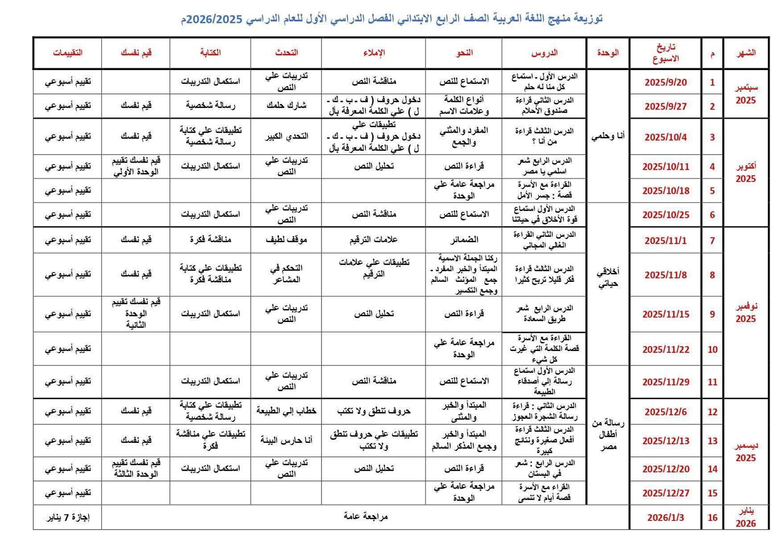 توزيع منهج اللغة العربية رابعة ابتدائي الترم الأول 2026