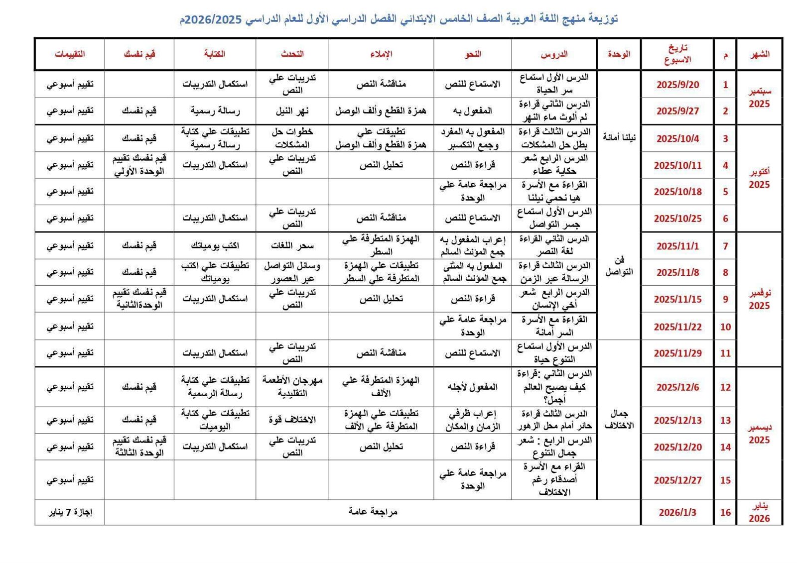 - توزيع منهج عربي الصف الخامس الابتدائي
