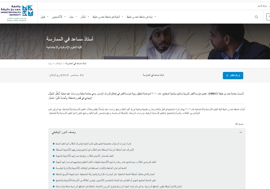 وظيفة جامعة.. أعلنت جامعة حمد بن خليفة، إحدى الجامعات المرموقة في قطر والتابعة لمؤسسة قطر للتربية والعلوم وتنمية المجتمع، عن توفر فرصة عمل أكاديمية متميزة بدرجة أستاذ مساعد في الممارسة بكلية العلوم الإنسانية والاجتماعية.
