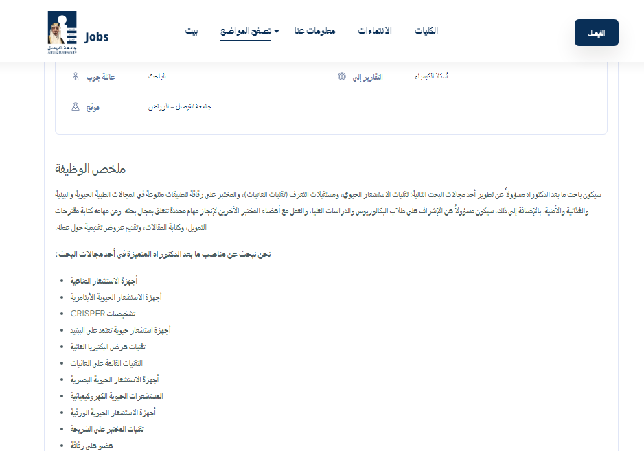 وظيفة جامعة.. أعلنت جامعة الملك فيصل السعودية في الرياض عن توافر وظيفة بحثية متميزة لشغل منصب **باحث ما بعد الدكتوراه في كلية العلوم – قسم الكيمياء، وذلك في إطار جهود الجامعة لتطوير أبحاث متقدمة في مجالات التكنولوجيا الحيوية وأجهزة الاستشعار الحيوية والتقنيات الحديثة للمختبرات على الشريحة.