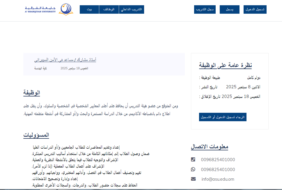 وبحسب ما ورد في الإعلان، فإن طبيعة العمل ستكون بدوام كامل، على أن يكون تاريخ الإعلان الرسمي للوظائف يوم الاثنين 8 سبتمبر 2025، بينما سيكون إغلاق باب التقديم يوم الخميس 18 سبتمبر 2025. وقد دعت الجامعة الراغبين في التقديم أو الاستفسار إلى التواصل عبر أرقام الهاتف المعلنة وهي: 0096825401000 – 0096825401000.