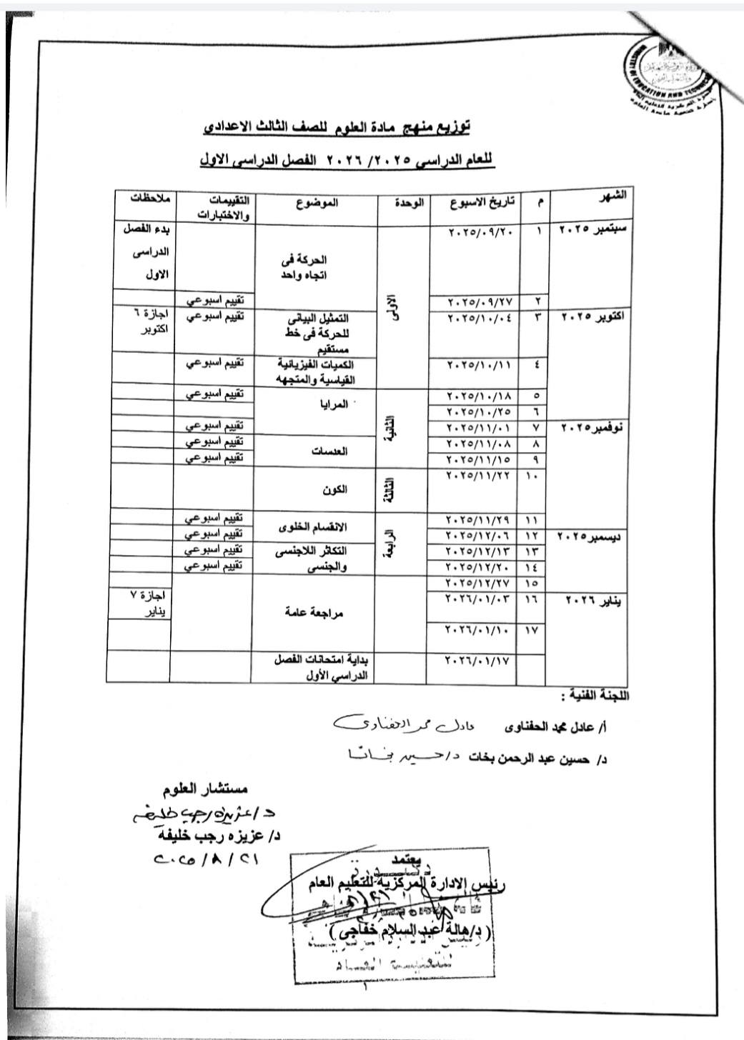 - توزيع منهج العلوم ترم أول لـ الصف الثالث الإعدادي