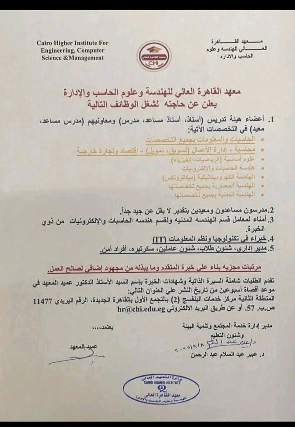 - أخبار وظائف معهد القاهرة العالي للهندسة اليوم