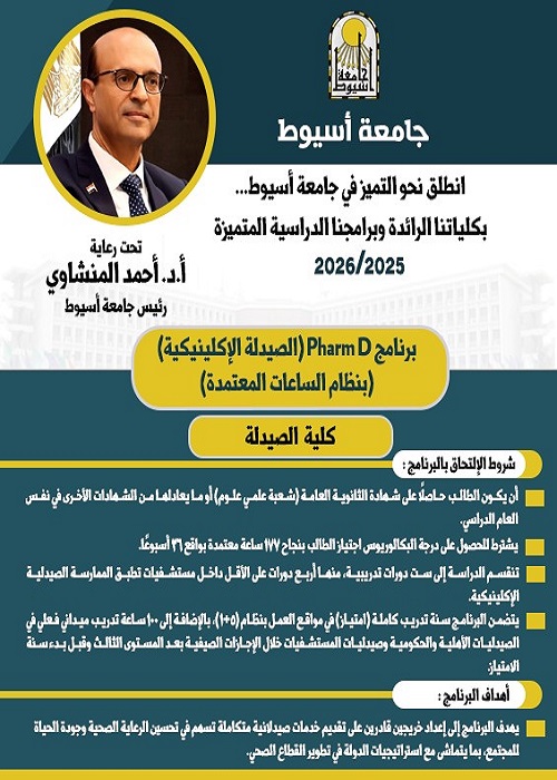أعلنت جامعة أسيوط عن إطلاق برنامج Pharm D (الصيدلة الإكلينيكية) بنظام الساعات المعتمدة اعتبارًا من العام الجامعي 2025/2026، ليكون إضافة قوية لبرامج التعليم الصيدلي في مصر. ويأتي هذا البرنامج في إطار خطة الجامعة لتطوير المنظومة الأكاديمية وتقديم برامج تواكب متطلبات سوق العمل المحلي والدولي، وتسهم في رفع جودة الخدمات الصحية.
