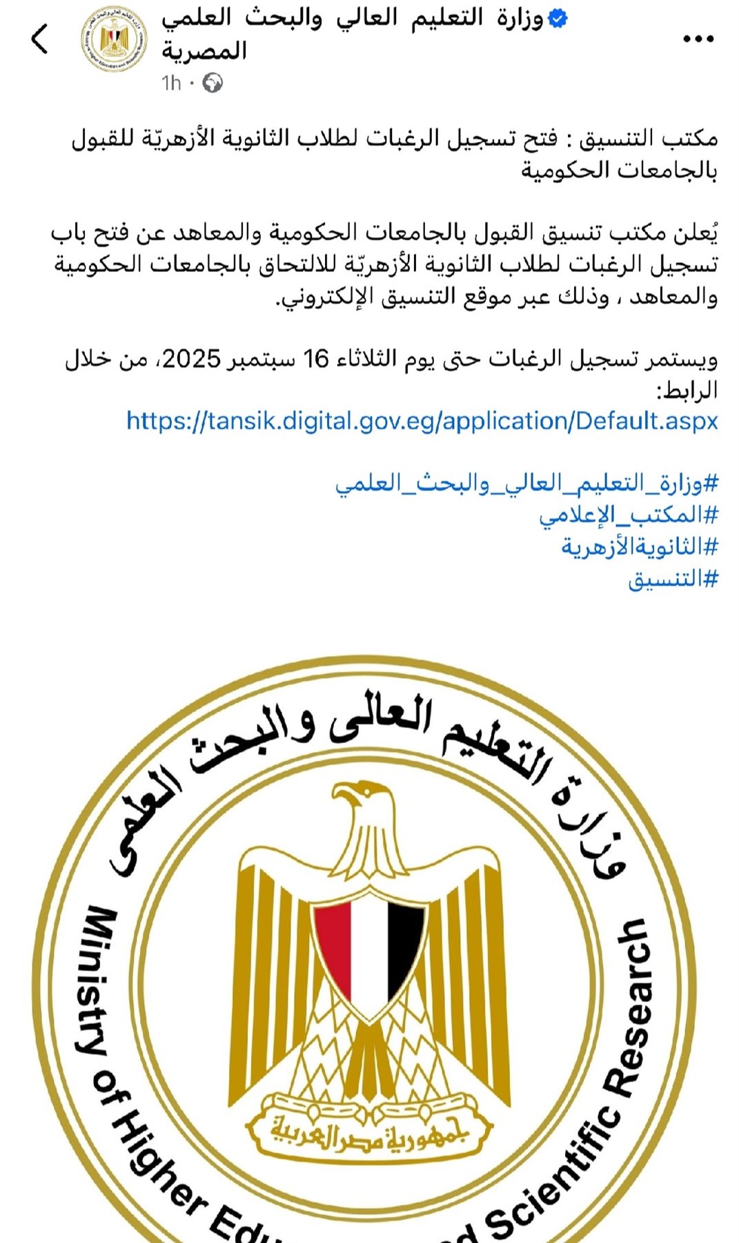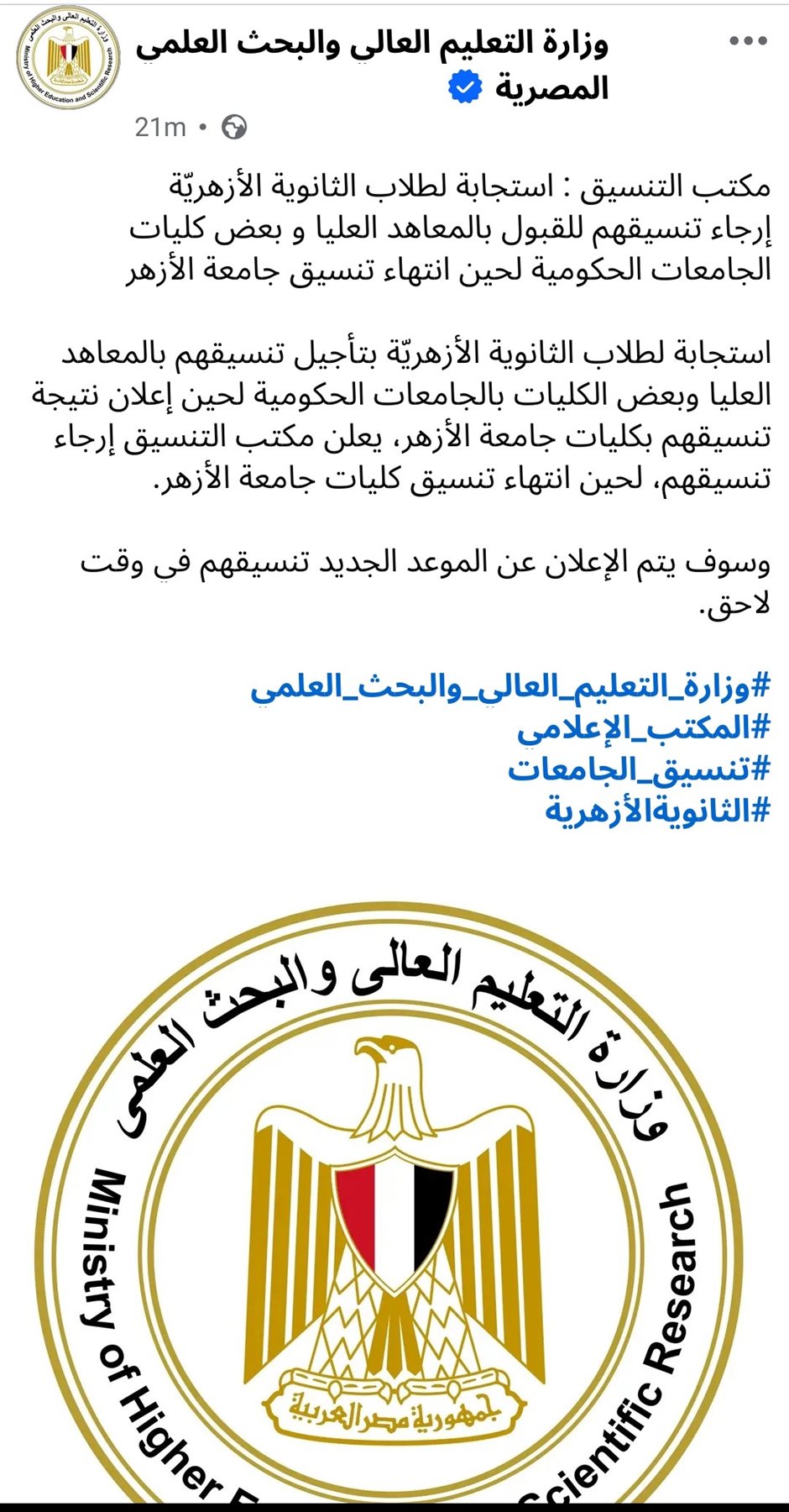 على مسئوليتى الشخصية أؤكد أن البيان الذى أصدره مكتب تنسيق القبول بالجامعات منذ ساعات اليوم السبت حول فتح باب التقدم لطلاب الثانوية الأزهرية للقبول بالجامعات المصرية من الآن وحتى الثلاثاء القادم والمنشور على الصفحة الرسمية لوزارة التعليم العالى ـ كما هو مرفق ـ هو بيان خاطئ فى توقيته وصياغته لأن مكتب تنسيق القبول بالجامعات ذاته لم يفتح أبوابه بعد لطلاب الثانوية الأزهرية حتى الآن وحتى يقال أنه مستمر حتى يوم الثلاثاء القادم كما جاء بنص البيان ـ ولايعرف أحد من الذى صاغ هذا البيان ؟، ومن الذى أصدره وسمح بنشره على الموقع الرسمى للوزارة حتى يتم نشره بهذه الصورة على موقع الوزارة ؟
