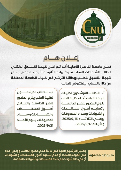 أوضحت جامعة القاهرة الأهلية أنه بالنسبة للطلاب المرشحين في كليات الجامعة المختلفة — باستثناء كلية الطب — يتوجب الحضور إلى مقر الجامعة يومي الثلاثاء 16 سبتمبر 2025 والأربعاء 17 سبتمبر 2025 لتسليم أصول المستندات والشهادات وسداد المصروفات المقررة.