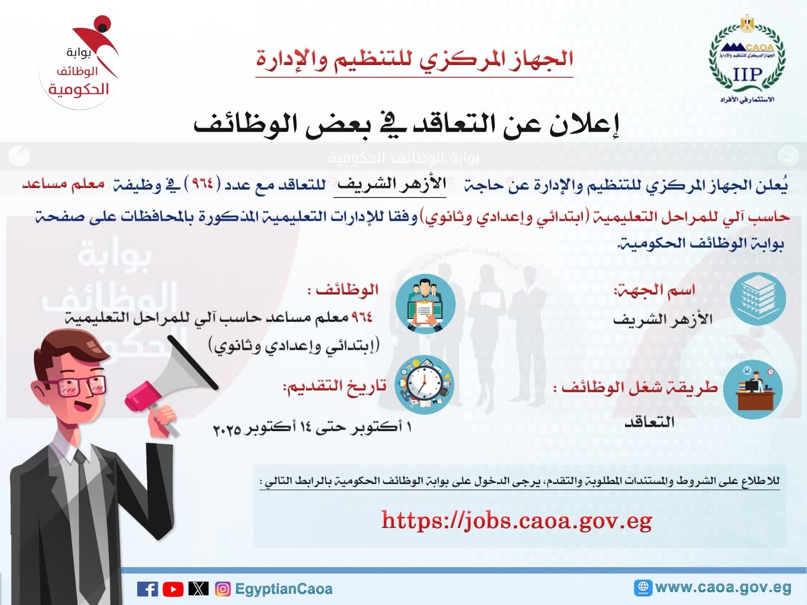 وظائف الأزهر 2025.. أعلن الجهاز المركزي للتنظيم والإدارة برئاسة المهندس حاتم نبيل عن طرح وظائف الأزهر 2025 للتعاقد مع عدد 964 معلم مساعد حاسب آلي للعمل في المراحل الابتدائية والإعدادية والثانوية، وفقًا للتوزيع بالمحافظات المتاحة عبر بوابة الوظائف الحكومية.