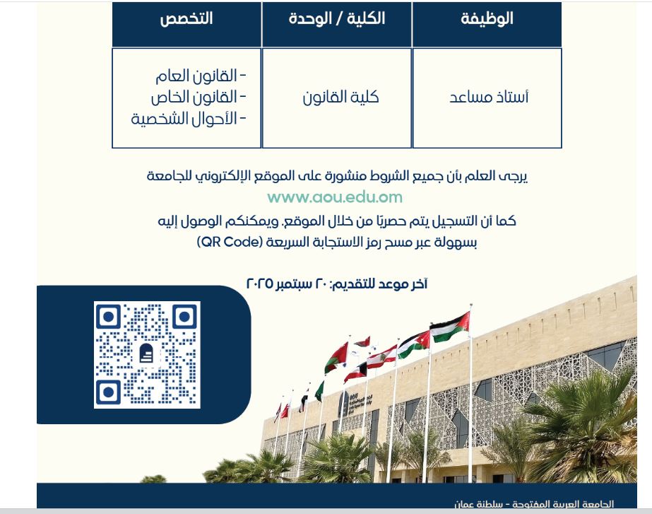 تعلن كلية القانون بالجامعة العربية المفتوحة في سلطنة عُمان عن رغبتها في الاستعانة ببعض أعضاء هيئة التدريس (أستاذ مساعد ) للعمل بنظام الدوام الجزئي (part time) للفصل الدراسي الأول من العام الأكاديمي 2025-2026 في التخصصات الآتية: