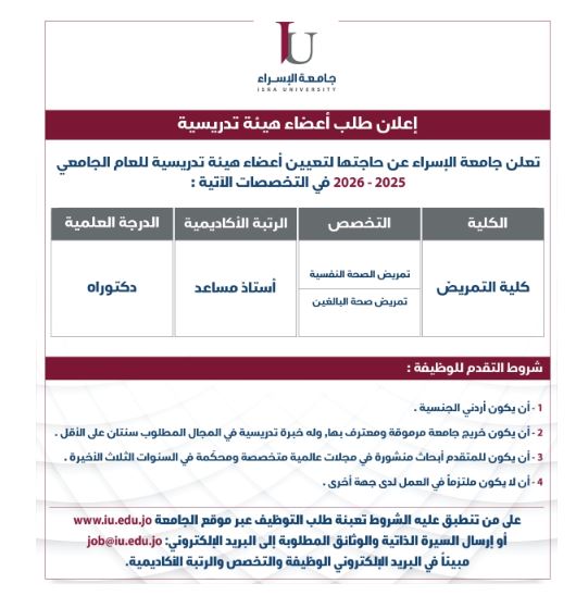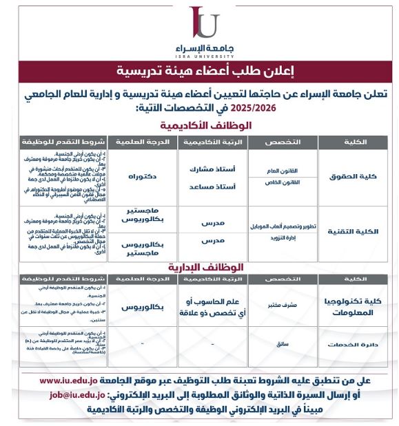 الشروط المطلوبة في وظائف جامعة الإسراء