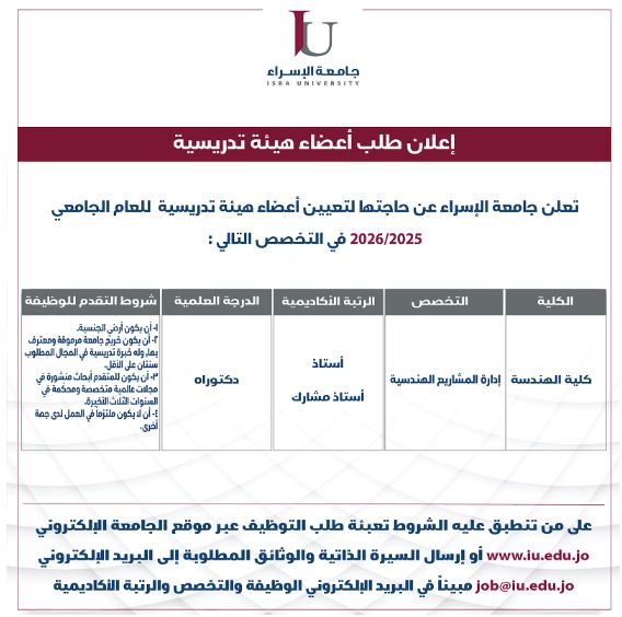 - أعضاء هيئة التدريس وظائف جامعة الاسراء