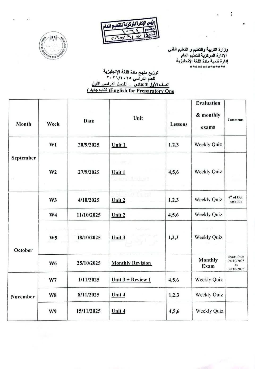 توزيع منهج الفصل الدراسي الأول في مادة اللغة الانجليزية الصف الأول الاعدادي