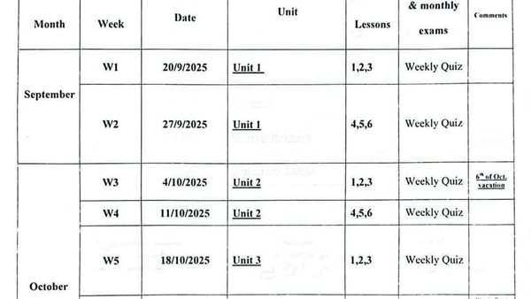 ويستعرض موقع السبورة توزيع منهج الفصل الدراسي الأول في مادة اللغة الانجليزية 2025 لطلاب الصف الأول الاعدادي، والذي جاء كالتالي: