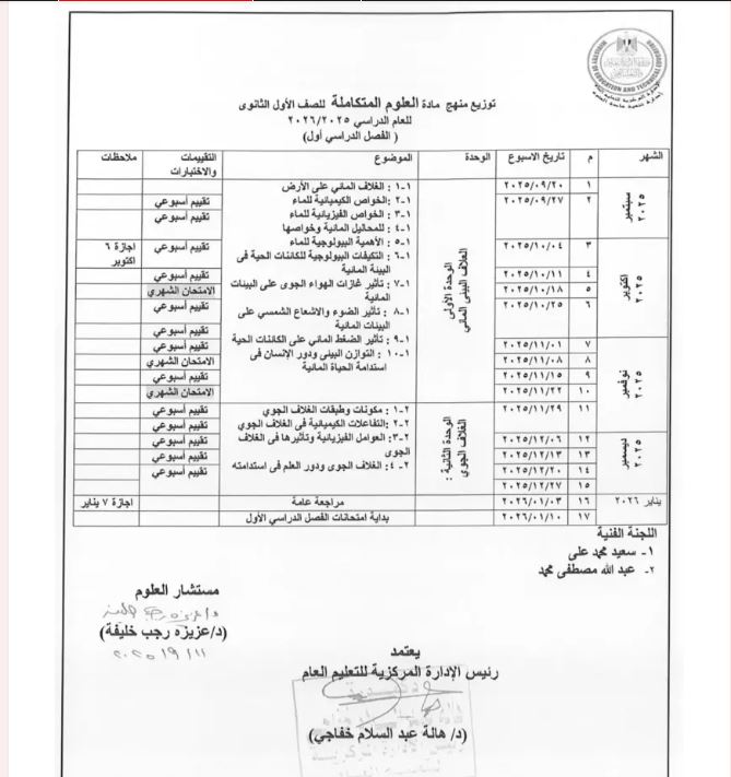 - توزيع منهج العلوم المتكاملة ترم أول أولى ثانوي