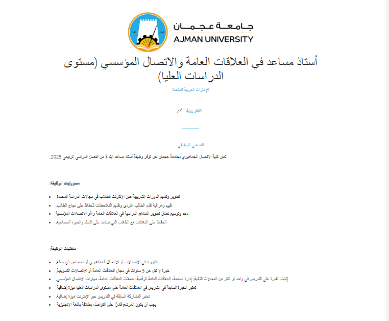 وظيفة جامعة.. أعلنت جامعة عجمان عن فتح باب التقديم لشغل وظيفة أستاذ مساعد في تخصص العلاقات العامة والاتصال المؤسسي ضمن كلية الاتصال الجماهيري، وذلك ابتداءً من الفصل الدراسي الربيعي لعام 2025.