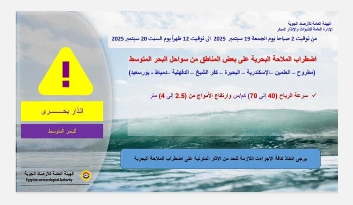 كما حذّرت الهيئة من اضطراب الملاحة البحرية على سواحل مطروح، العلمين، الإسكندرية، البحيرة، كفر الشيخ، الدقهلية، دمياط وبورسعيد، مع سرعات رياح تتراوح بين 40 و70 كم/س، وارتفاع أمواج يصل إلى 4 أمتارحالة الملاحة البحرية غدًا الجمعة.