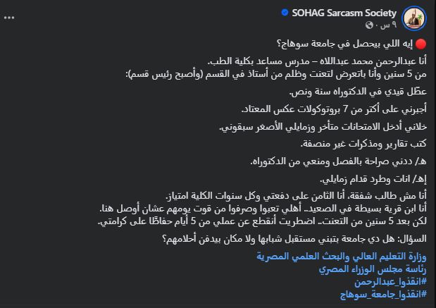 انتشر على مواقع التواصل الاجتماعي خلال الساعات الماضية منشور للمدرس المساعد بكلية طب جامعة سوهاج، عبدالرحمن محمد عبداللاه، كشف فيه عن تعرضه لما وصفه بـ"تعنت إداري وشخصي" استمر لمدة خمس سنوات من أحد أعضاء هيئة التدريس بالقسم، والذي يشغل حاليًا منصب رئيس القسم، وهو ما أدى إلى تعطيل مسيرته الأكاديمية وتأخره في التسجيل لدرجة الدكتوراه، إلى جانب ضغوط نفسية وصفها بالقاسية.